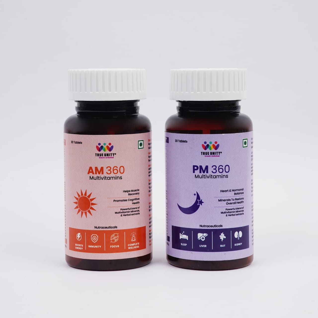 AM 360 Multivitamins is a complete blend of essential vitamins, minerals, and herbal antioxidants designed to boost daily energy, immunity, and focus. With nutrients like Green Tea, Grape Seed, Ginseng, and B-complex vitamins, it supports cognitive clarity and overall wellness.